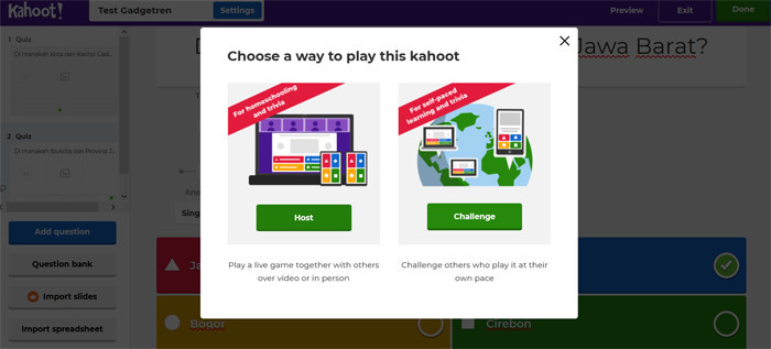 Membuat kuis online singkat untuk mahasiswa dengan menggunakan "kahoot" masuk di. Kahoot adalah sebuah aplikasi berbasis web untuk membuat quiz online (berbentuk games interaktif) yang dapat diakses oleh banyak orang secara . Berikut tips dari kami :) Sebelum memulai kuis jelaskan dulu ke mahasiswa tentang tata cara . Setelah berhasil akan muncul pilihan cara bermain kahoot, pilih mode "teach".