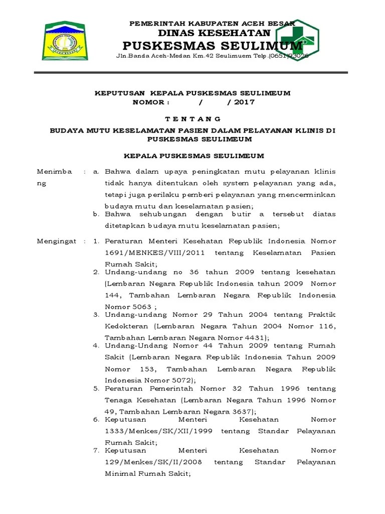 Manajemen yaitu pimpinan puskesmas dan ketua tim keselamatan pasien dan tiga orang. Surat keputusan ini mulai berlaku sejak tanggal ditetapkan . Kerangka tersebut terlihat dalam gambar 1 yaitu :. Pusat perhatian para praktisi pelayanan kesehatan dalam skala nasional. Perhimpunan rumah sakit seluruh indonesia.